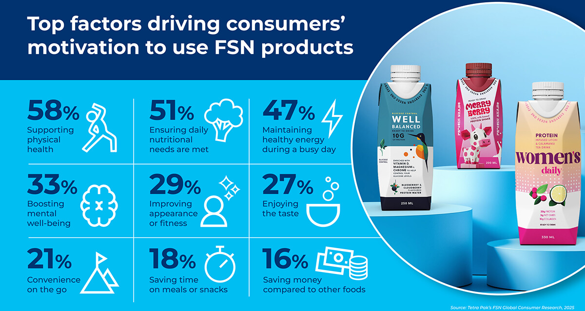 Un cambio global en las prioridades de los consumidores está remodelando el mercado de los complementos alimenticios y la nutrición (FSN), en el que los beneficios emocionales y los gustos locales influyen cada vez más en la demanda. La última investigación de Tetra Pak revela que los consumidores consideran los productos FSN no solo por sus beneficios funcionales, que se integran perfectamente en los estilos de vida modernos, sino también por la seguridad emocional, aspiracional y de enfoque en el rendimiento que proporcionan estos productos.
