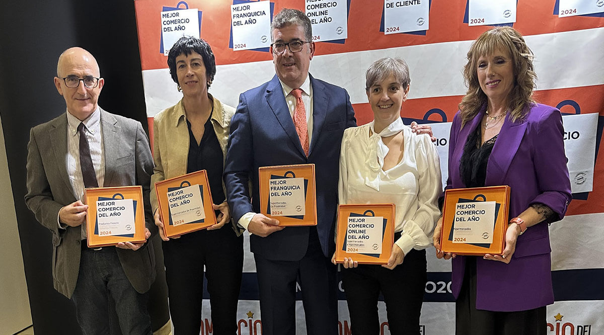 Eroski ha recibido cinco galardones en la decimotercera edición de los Premios Comercio del Año 2023-2024. Concretamente ha sido premiada en las categorías de comercio online, productos frescos, hipermercados, supermercados de proximidad y franquicias.