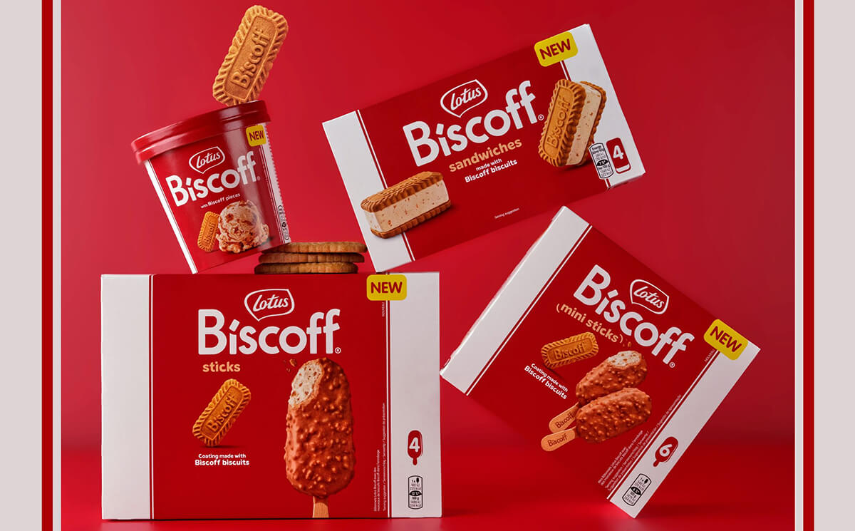 -Bombón indulgente Lotus Biscoff, disponible en formato multipack x3 en retail y unidad individual en impulso y conveniencia, y Mini Bombón Lotus Biscoff, en formato multipack 6 x 50 mililitros en retail. Se trata de una versión con una receta reformulada y mejorada del bombón helado, que juega con los elementos sensoriales únicos de Biscoff, con cremoso helado y trozos de galleta Biscoff, recubiertos en una nueva y exclusiva capa hecha con auténticas galletas Biscoff. Este formato ofrece una experiencia indulgente y multitextura que combina el suave helado con el característico crujido y sabor caramelizado de Biscoff.