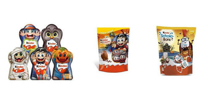 -Kinder Schoko-bons: El clásico e inconfundible sabor de Kinder, con deliciosos trocitos de avellana, vuelve decorado especialmente para la ocasión. Este formato de Schoko-Bons es ideal para regalar en la noche de Halloween.