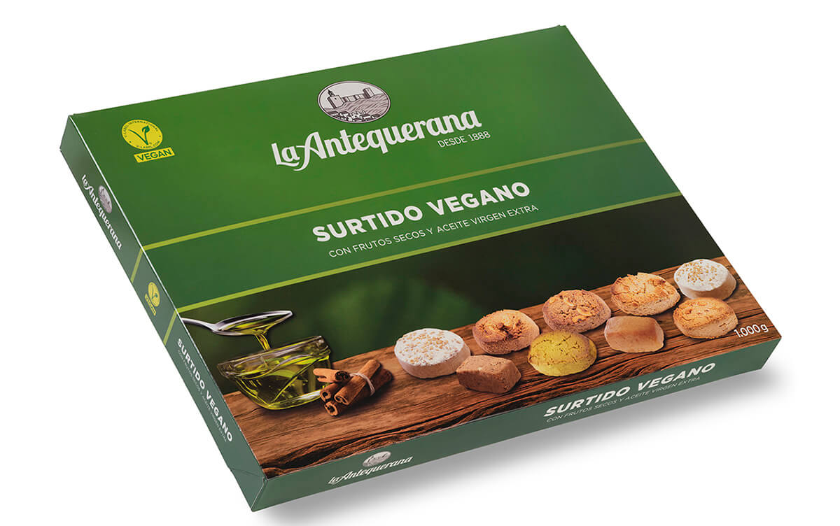 Está compuesta por 30 piezas artesanales, entre las que se incluyen: polvorones de pistacho, nuez de Brasil, avellana, anacardo y almendra; los mantecados de aceite de oliva virgen extra y almendra; o especialidades como los Besitos y las Delicias de Almendra. Los 9 productos que componen este surtido tan especial no contienen ningún ingrediente de origen animal, utilizando en su lugar aceite de oliva virgen extra o manteca de cacao, además de frutos secos de gran calibre.