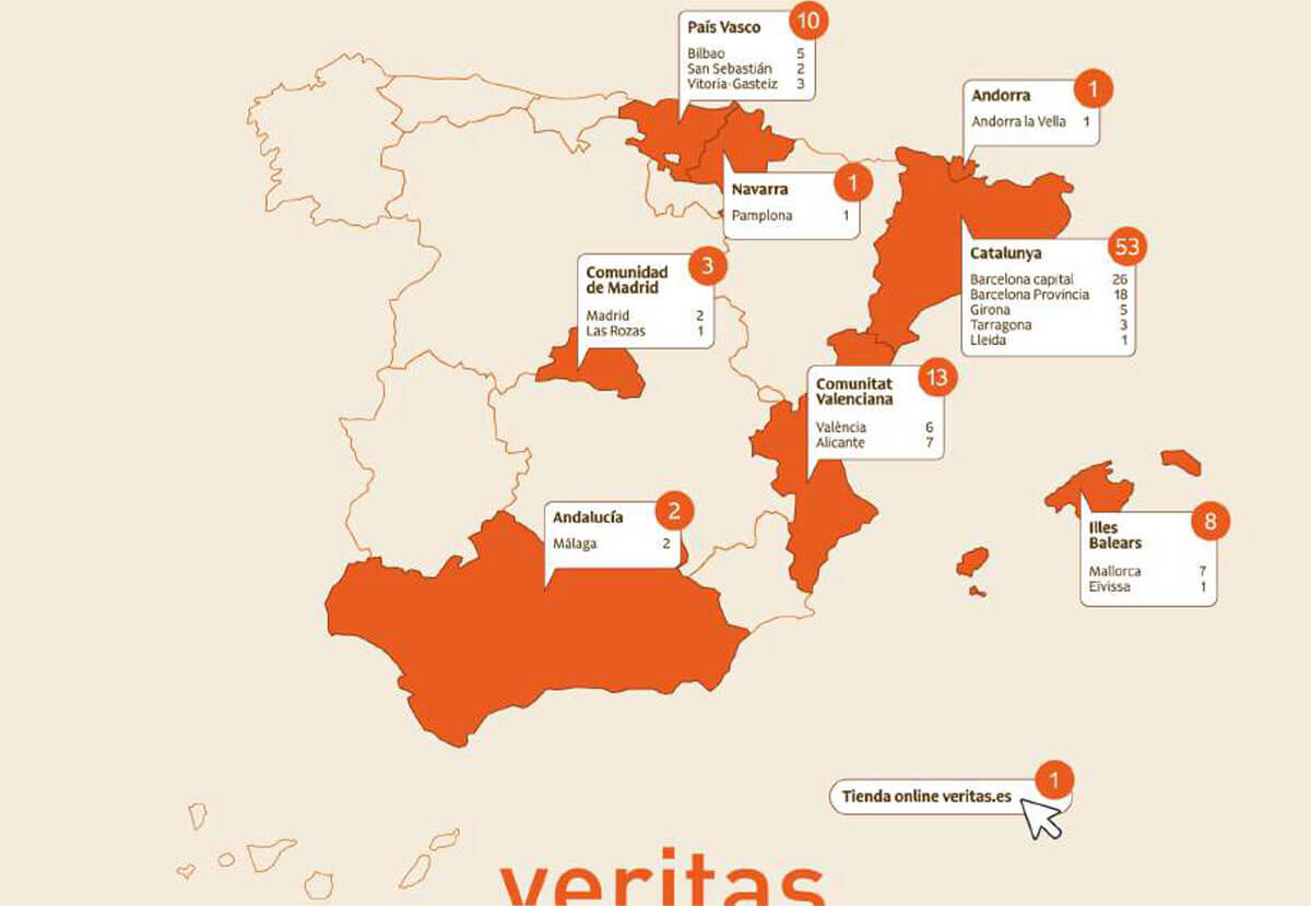 En concreto, la compañía catalana vuelve a abrir en Barcelona, ciudad donde nació Veritas y donde tiene una posición madura y consolidada con 26 tiendas. Además de la Ciudad Condal, Veritas ha continuado su crecimiento por el resto del territorio, donde ya dispone de un parque comercial de 91 puntos de venta, distribuidos así: 53 en Catalunya, 13 en la Comunitat Valenciana, 10 en País Vasco, ocho en les Illes Balears, tres en la Comunidad de Madrid, dos en Andalucía, una en Navarra y otra en Andorra.